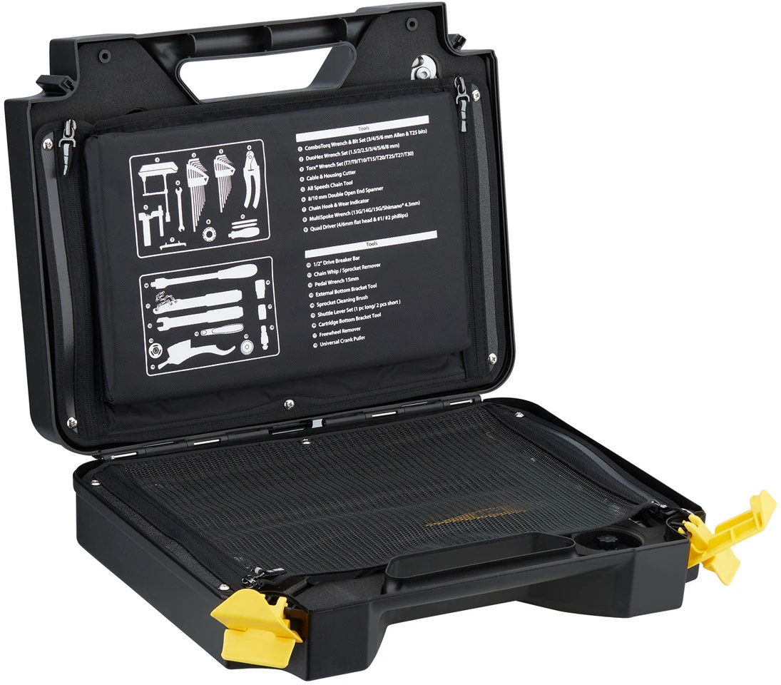 Die PrepBox von Topeak ist ein stabiler Werkzeugkoffer voll mit sämtlichem Profiwerkzeug, das man für ein Fahrrad braucht. 36 Teile mit 55 Funktionen warten und reparieren alles, von der Speiche bis zur Kette.